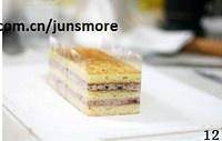再刷上朗姆酒糖浆,抹上另一半蓝莓奶油,盖上第三片蛋糕片,并刷上朗姆酒糖浆。做好的蛋糕放入冰箱冷藏1个小时左右,使之定型