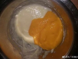9.芒果慕斯糊分成两份,先加一般 放入芒果
