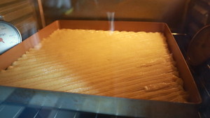 将面糊均匀的挤入烤盘,下一条要压着上一条的底边,不然烤好以后容易散开