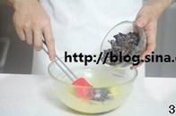 把事先切碎的黑巧克力倒入蛋黄混合物里,并趁热不断搅拌
