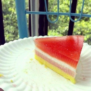但是……其实味道还好吃。一口吃下去,QQ糖的味道-西瓜的味道-酸奶的味道-还有淡淡的奶油味道。 很清爽不甜腻,很适合夏天。 切块比蛋糕本身好看很多这是做孽啊!