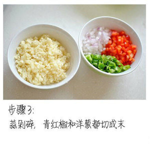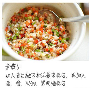 加入青红椒末和洋葱末拌匀,再加入盐、糖、蚝油、黑胡椒拌匀