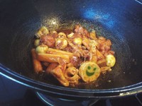 炒:底料炒好以后倒入荤食材炒一会儿后再倒入素食材+花生,一直炒到全熟为止,过程中不加一滴水。