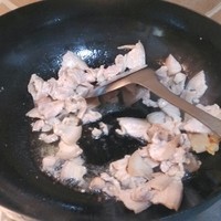 大火翻炒,一直到汤汁快收干时,倒入切片的大葱,翻炒几下。