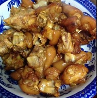 这个步骤我忘记拍过程。放油烧热后放冰糖小火炒滑,然后放刚刚高压锅压耙的猪蹄,翻炒后加生抽上色,炒掉水份,将猪蹄漏起来,油留下。