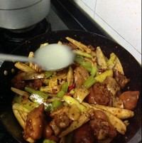 料炒香后倒入猪蹄,翻炒,翻翻翻!
