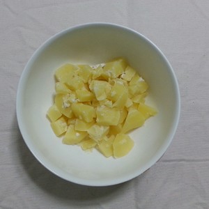 捣成泥。煮马铃薯的汤汁放旁边备用。