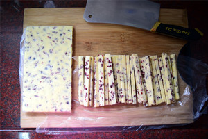 Tip:1、如果买到的蔓越莓个头大,最好切碎再加入,如果本身比较碎,可以直接加入。 2、面团冻到可以切成条即可,不要冻得太硬,否则很难切开,而且容易切断。 3、用其他品牌的烤箱,温度和时间以及放置的烘焙位置请注意调整。其他品牌,烘焙时请放置中层。