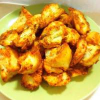 把辣椒面儿(俺家辣椒面儿,都是自制的,绝对香辣),盐,烧烤料倒入水,调成料汁儿,均匀洒在馒头块儿上,翻滚一下,料汁儿沾的越匀,烤出来越好吃。
