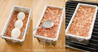 将熟鸡蛋整齐的放在中间。 再将剩余的一半肉馅填入压紧。