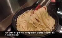 5分钟后蒜片变柔软,那么就可以关火等意面煮熟。待意面到时后把它移进油锅,充分混合。
