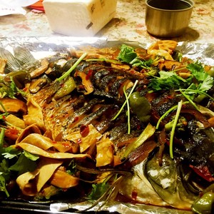 腌好之后,把葱姜扔掉。在锅里放油,多放点,炒配菜还要用。冷油状态放入整花椒炸,直到花椒变黑。关火,把花椒捞干净扔掉。用小勺或者刷子蘸炸好的花椒油淋在鱼身上。放入烤箱,上下火 中层 200度烤30分钟。在这期间,每隔五分钟到十分钟,拿出来刷一次花椒油。最后五分钟可以关掉下加热管,换到上层,看鱼皮。