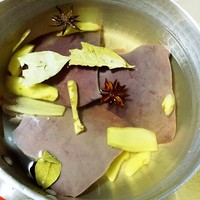 锅内加清水至没过猪肝,加姜片、黄酒(绍兴花雕酒)、盐、糖、八角、桂叶,大火煮滚后转小火煮20分钟关火。