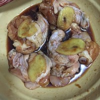 鸡腿切若干刀痕,用刀背捶打一下。加料酒、生抽、蚝油、姜腌制