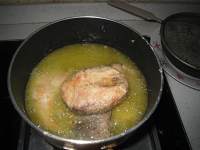 锅中橄榄油烧至七八成热,把腌好的鱼沾上生粉(尽可能把鱼身上的水份抹干),下锅炸;