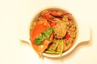 差不多可以出锅了,红彤彤的梭子蟹粘满辛香的绿咖喱。完成~