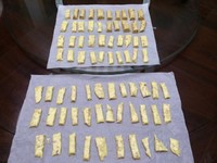 桌子上平铺好油纸将整团牛轧糖放上去再盖上一张油纸,然后用擀面杖压扁,厚度随你所好。压好后就把上面的油纸揭开,如果有点粘可以用冰冷的湿布敷一下就比较容易接下来了。