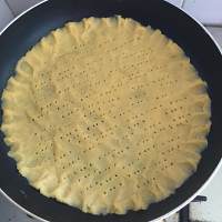 在平底锅里压平,周围高出2-3厘米。用叉子戳很多小孔。