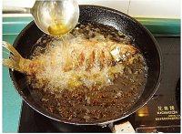 然后把鱼顺锅边划入油锅内,边炸边向鱼身上浇热油,中火炸至鱼皮变酥。