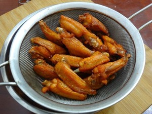 将表面的腌料清洗掉,上一层薄薄的淀粉浆但不宜太稀,入油锅炸两次,捞出控油。(1.清洗表面是为了炸的时候表面不会上色太深,影响,美观;2.第一次油炸是为了炸熟鸡翅,第二次油炸是为了上色和让表皮干香。)