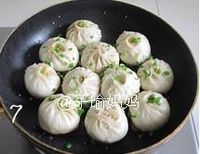 平底锅中倒入少许油,互不粘连的码上小笼包子,开火将包子底略煎