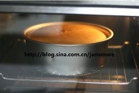 蛋糕烤好后出炉。蛋糕烤好后能膨胀到模具的8、9分满,顶部可能稍稍高出模具。
