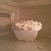 把棉花糖倒进可以微波的大碗,我的碗判断是失误有点儿小了...微波一分半钟,或者直到融化为止(每30秒拿出来看看哈 别过头了)