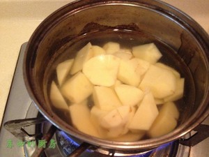土豆切滚刀块下冷水锅煮熟,捞出沥干水分;