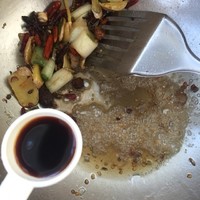 炒出香料味大约要一分钟 此时加入冰糖 因为锅里几乎没油 所以手边放一小碗水 慢慢的加 让冰糖可以融化