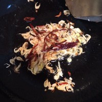 糠萝卜比较吸油,所以要放比平时炒菜多一半的油。油烧热,下葱姜和辣椒丝,炒出香味,放入虾皮,因为虾皮也比较吸油,所以不要炒时间长了。