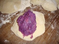 将榴莲肉与紫薯泥炼乳白糖混合,搅拌成馅,放冰箱备用。