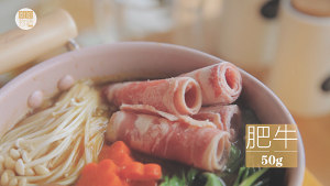 放入20g金针菇、1个香菇、10g青菜、50g胡萝卜、50g肥牛大火煮熟。