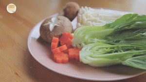 [ 鲜蔬咖喱乌冬锅 ] 准备爱吃的蔬菜:金针菇去根、香菇切花、胡萝卜用模具压制小花备用。