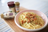 将蒜油和蒜瓣浇在意粉上,再浇两勺酱油,撒上之前煎好的培根丁,和自己喜欢的topping就可以啦!