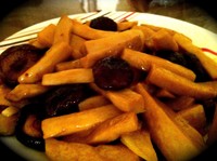 油热,葱姜蒜爆香,放入杏鲍菇和香菇,炒炒。放入一点料酒、生抽、一点点老抽、盐、糖(多放一点,去腥),再放一点水,炒炒。
