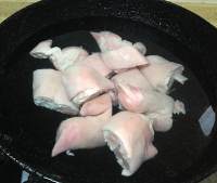 猪蹄斩块,换几道水来浸泡,之后滤去水份,备用。