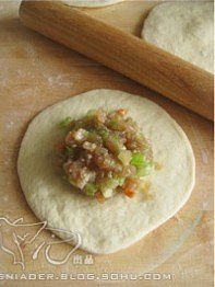 将肉馅放在圆皮中