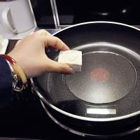 放好后调成中火,看到没有!!!看到没有!!!豆腐开始滋滋滋滋滋了~煎至从侧面可以看得出底面金黄的时候就可以翻面啦~