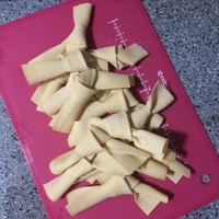 豆腐皮切合适大小,打个结,防止卤制时粘连