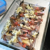 把炒好的蒜蓉铺放在每一个虾上,再把腌制的汁水也均匀的撒在虾上。