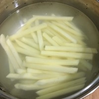 土豆去皮切条(条的大小形状没有限制按自己喜欢的样子来),我都切成了长条,用水泡两分钟然后将表面淀粉冲洗干净,这样表面比较光亮。