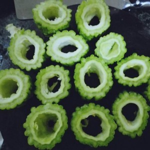 苦瓜洗净,头尾切掉,剩下部分切成每段4~6厘米的小段,把中间掏空。