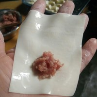 放入少量肉馅,因为是小馄炖皮很薄,一点点就好,我每次都贪心的放很多,结果被人嫌弃说是在吃鲜肉大馄炖^_-