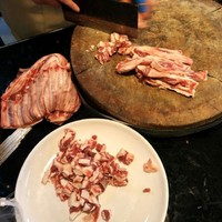 肉粒进味后穿成串,每串五粒肉,肥瘦搭配好