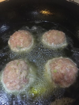 把摔好的狮子头,依次放入6分热的油锅里慢慢炸制俩面金黄捞出,锅里留少许底油,放入葱段、姜片,爆香后加入能没过狮子头的开水