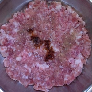 猪肉放盐、胡椒粉和生抽搅拌均匀后,腌制十五分钟。