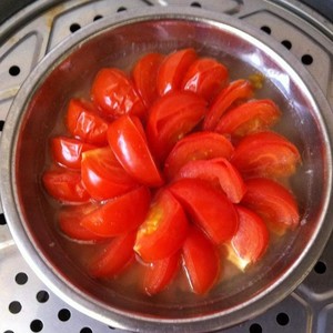 Tip:这个西红柿蒸猪肉不用加水,大火蒸熟后会有酸酸甜甜的汤汁,建议用深一点的碟子去蒸,未免汤汁流失喔~