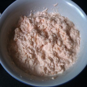2,一个小青柠挤汁,加干酪粉(喜欢吃出三文鱼味的这步可以不要,我是特意掩鱼味才加的,就怕爷俩一口吃出来); 3,加面粉调匀成粘面团,用勺子挖团进油锅,再整型压扁,无所谓造型,一面煎金黄再翻面,主要为了定型。