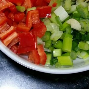 另起锅放油,炒香大红椒,倒入蒸豆角盘里的汁,再加入己调好的蚝油、酱油、生粉水和葱花,勾芡成汁。