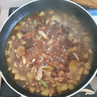 加半碗水,没过鸡肉土豆一半就好。(我就知道又得加多。结果真多了。噗。)加冰糖,翻炒至冰糖融化。